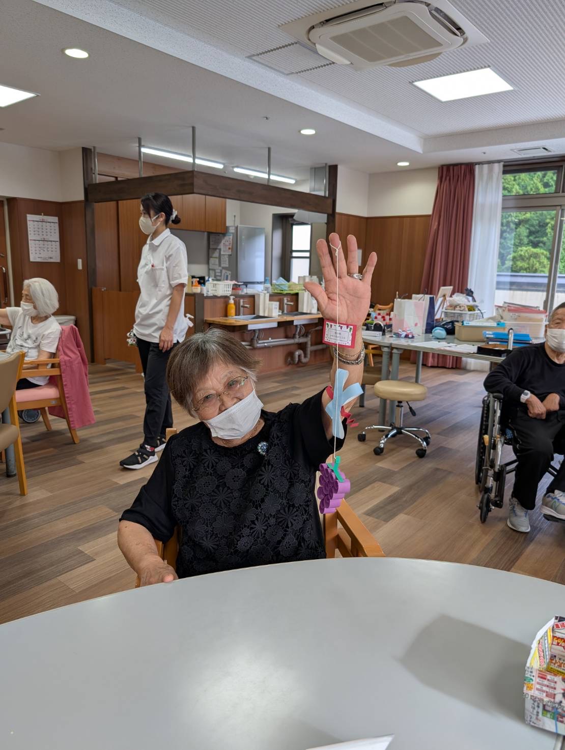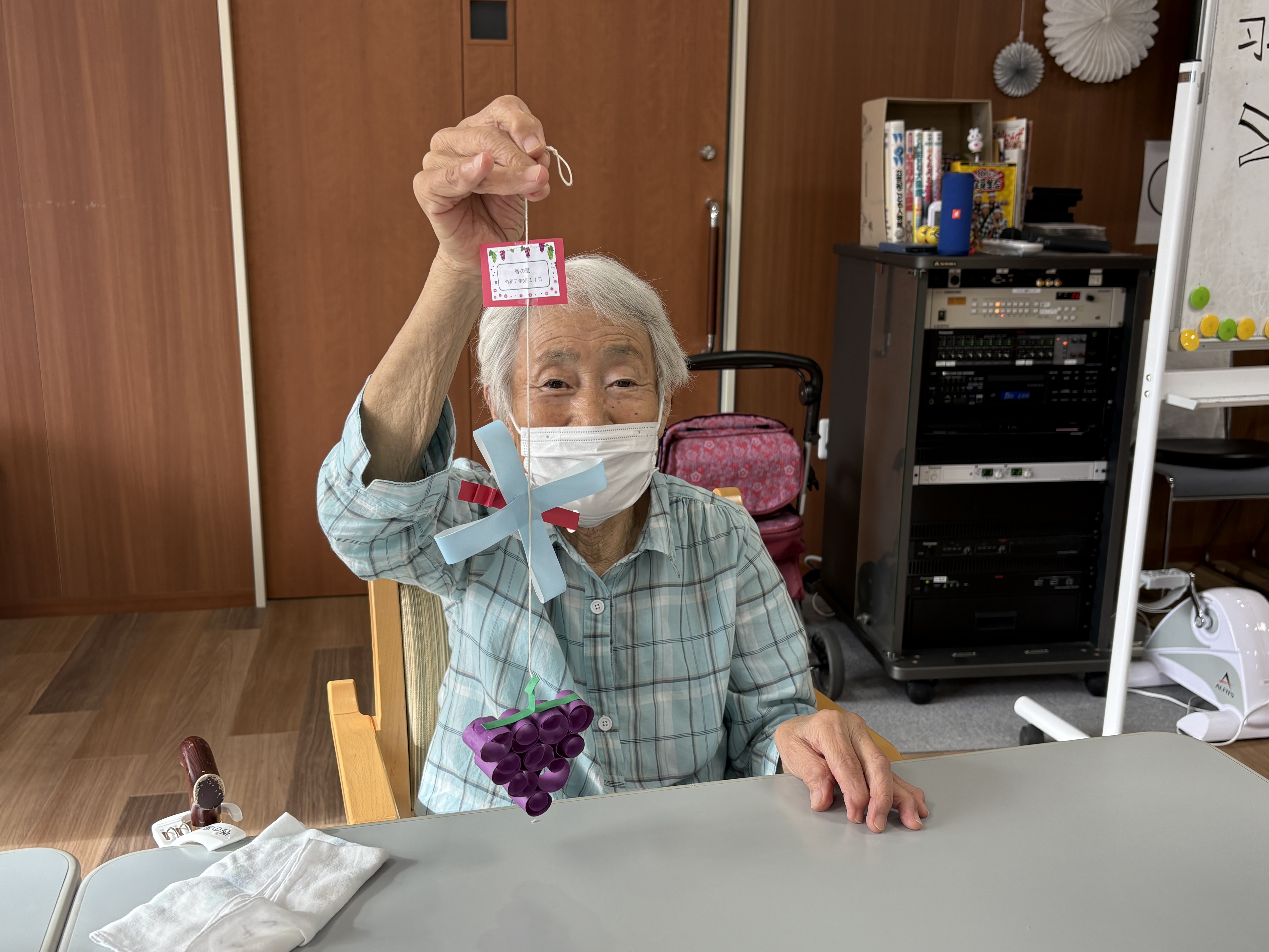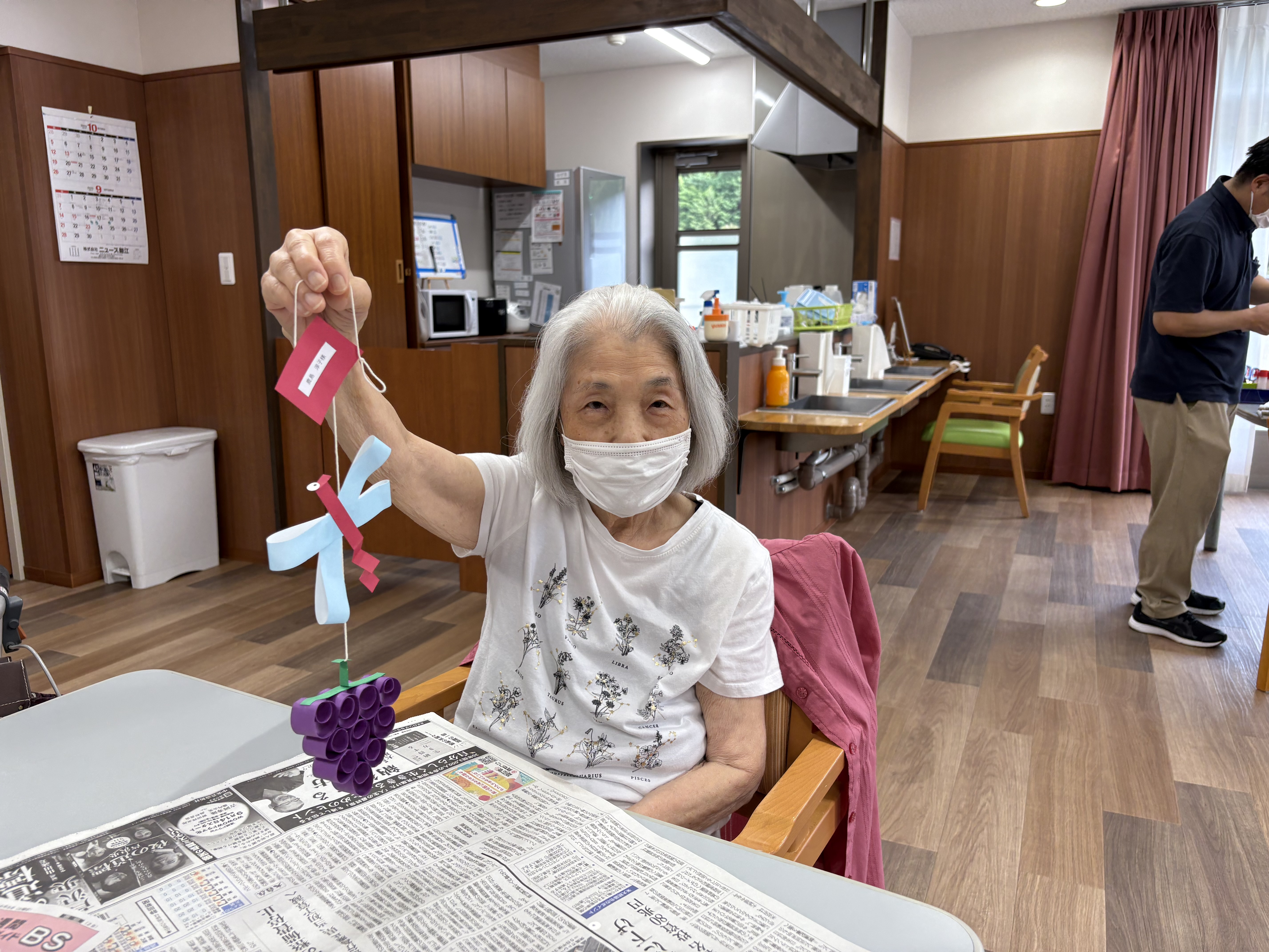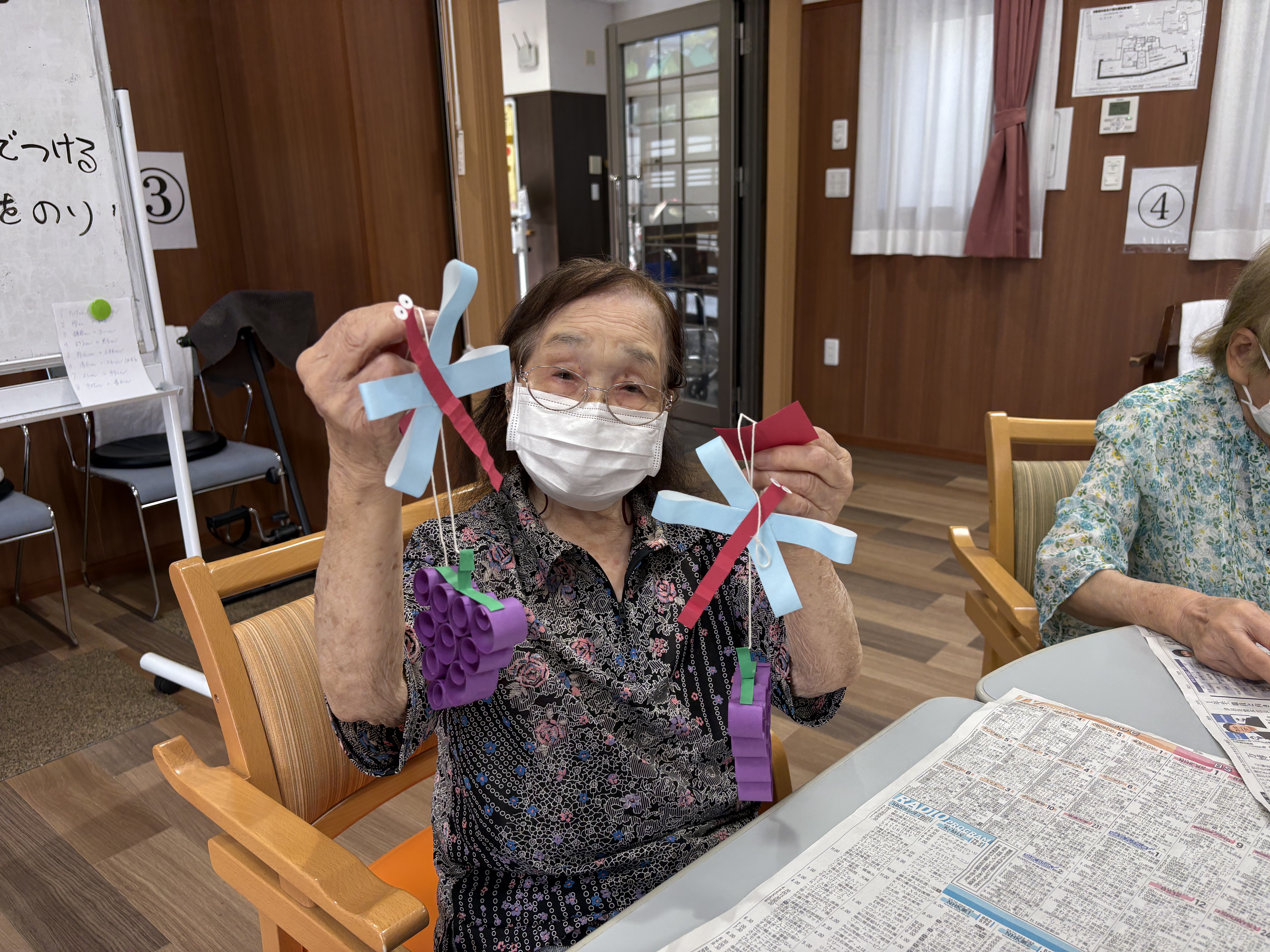 デイサービス ぶどうとトンボの飾り作り デイサービスでは、午後から9月の工作として、ぶどうとトンボの飾り作りをしました( ^)o(^ ) 1本の糸に、ぶどうと赤とんぼを付けていきます。 同じ向きに付けていくのが難しいんですっ💦