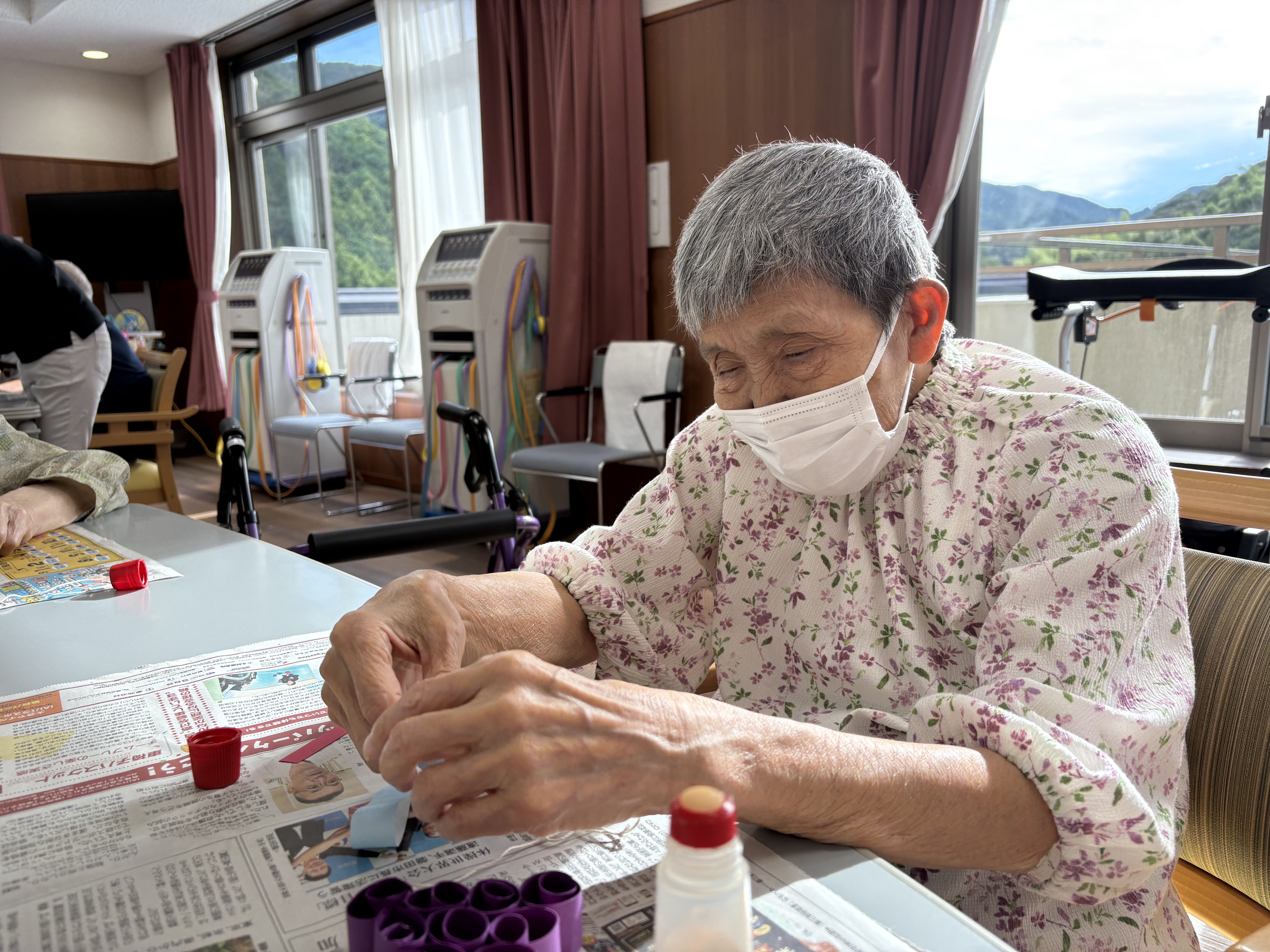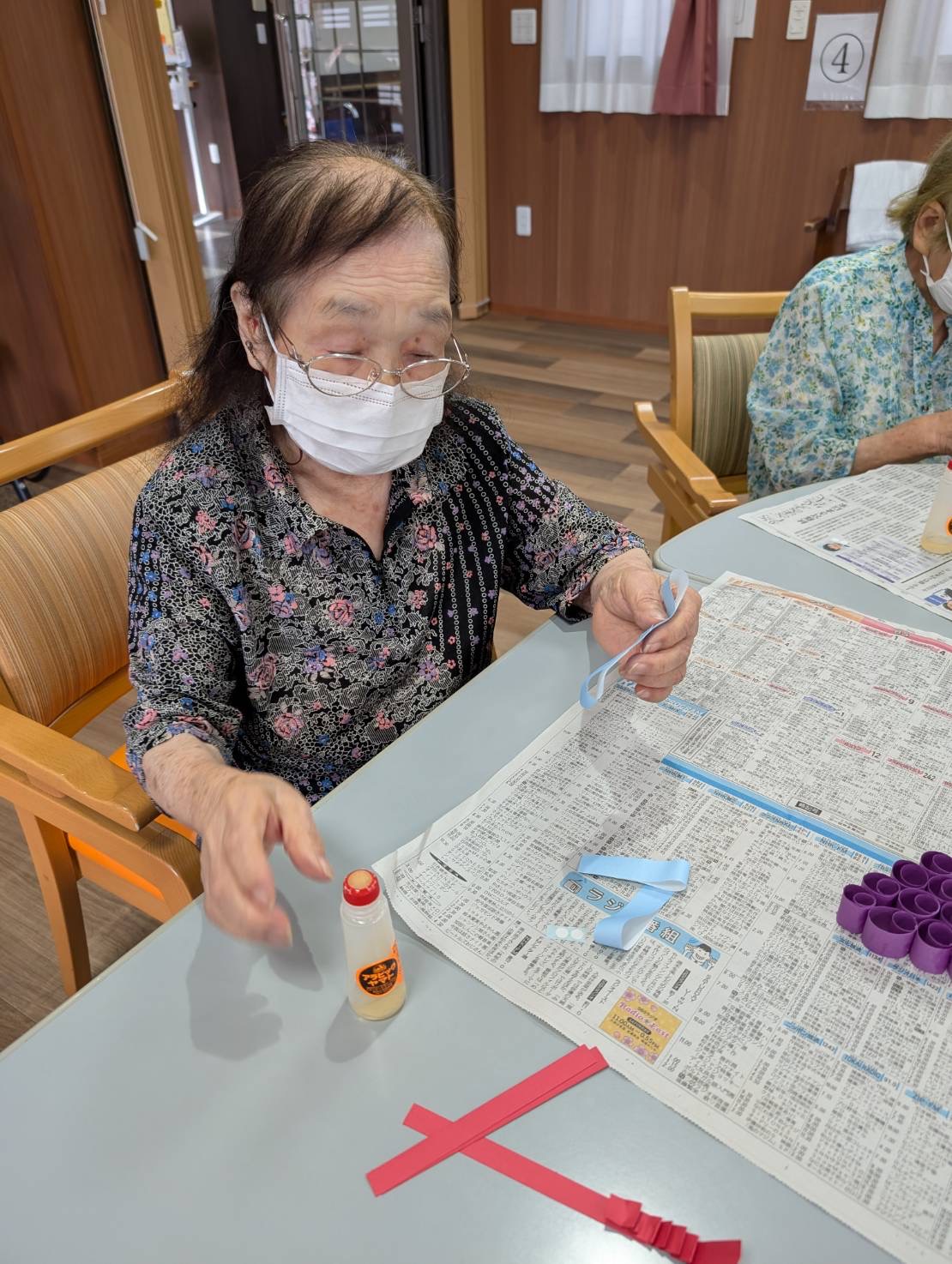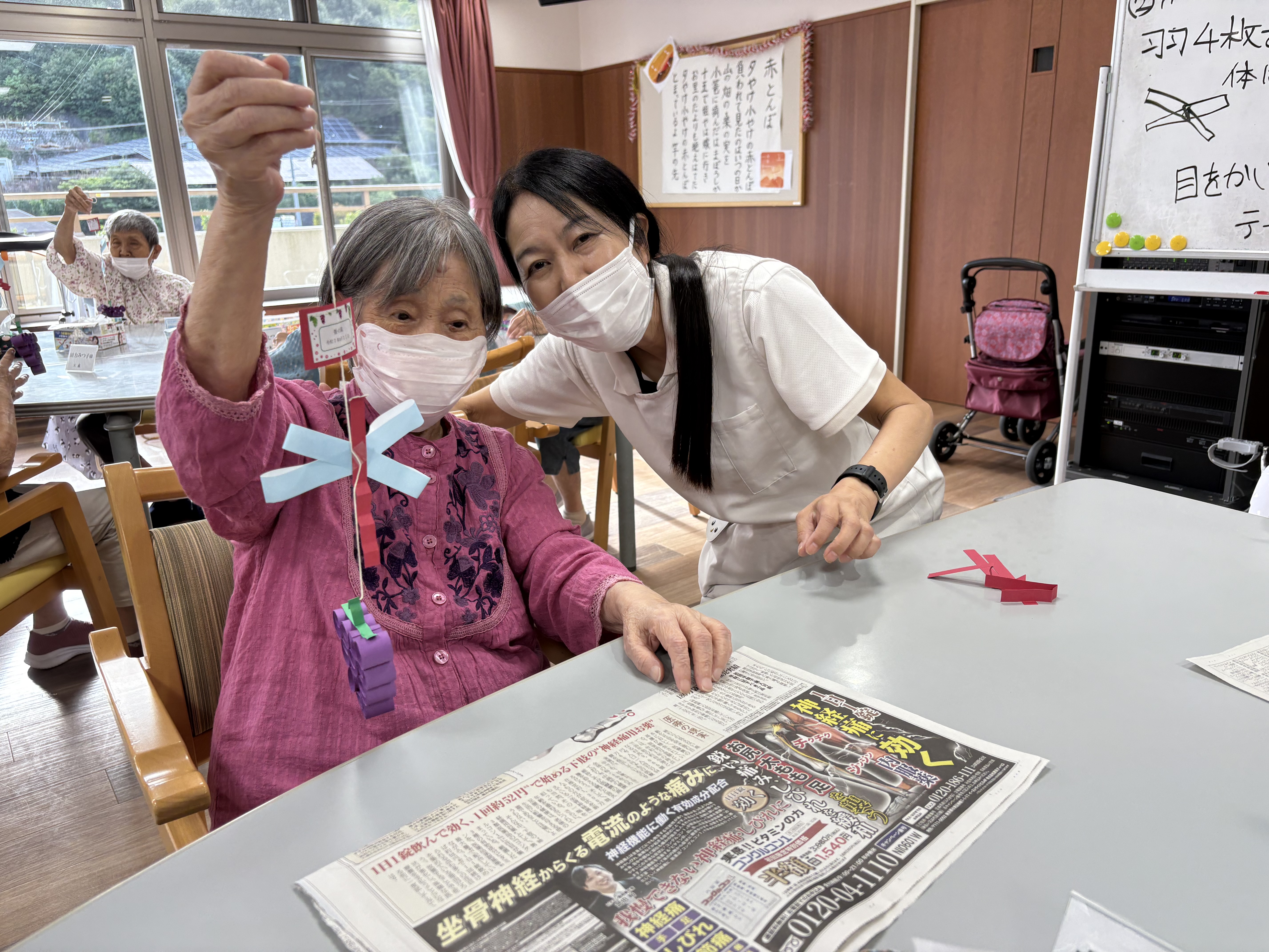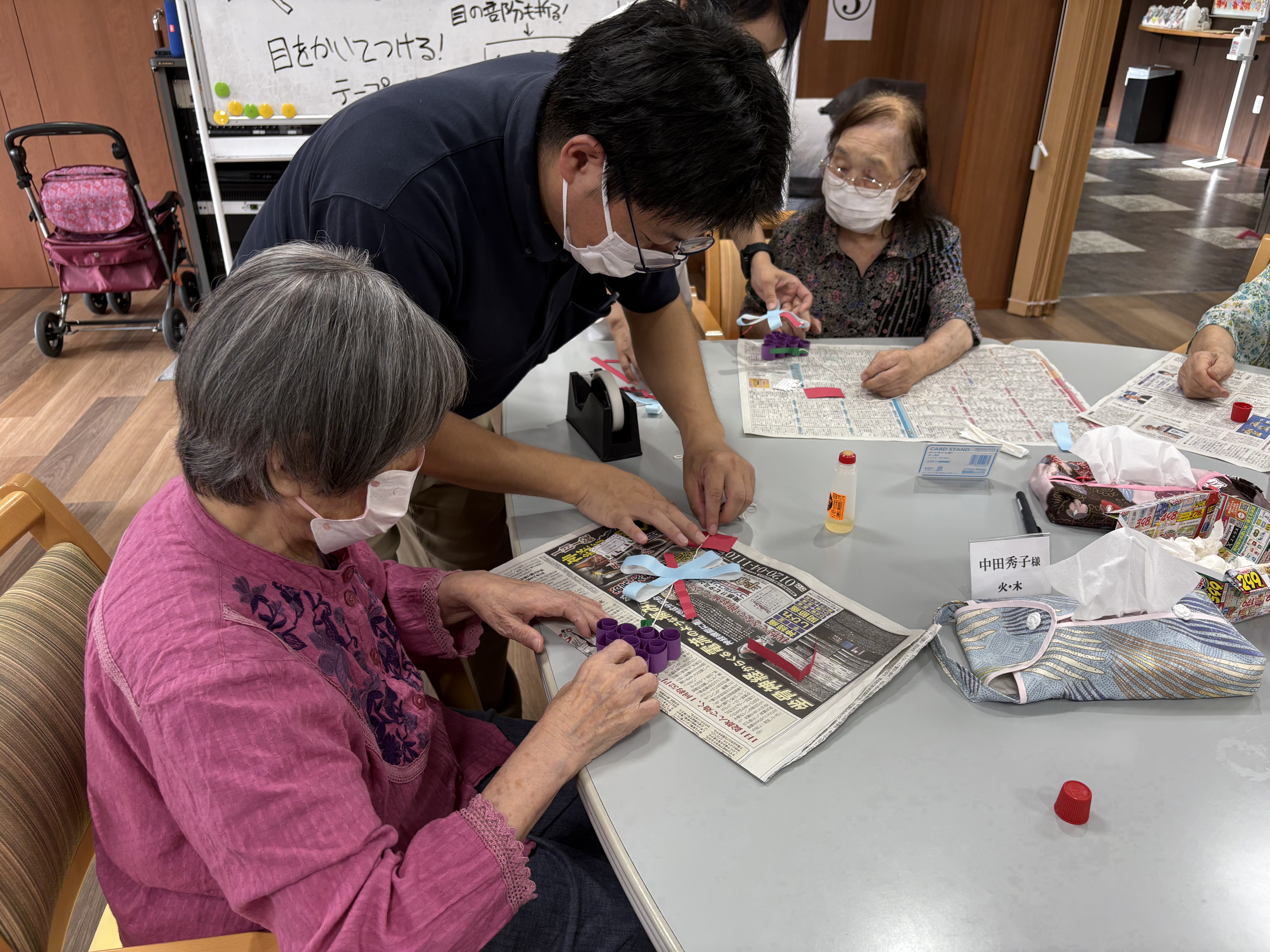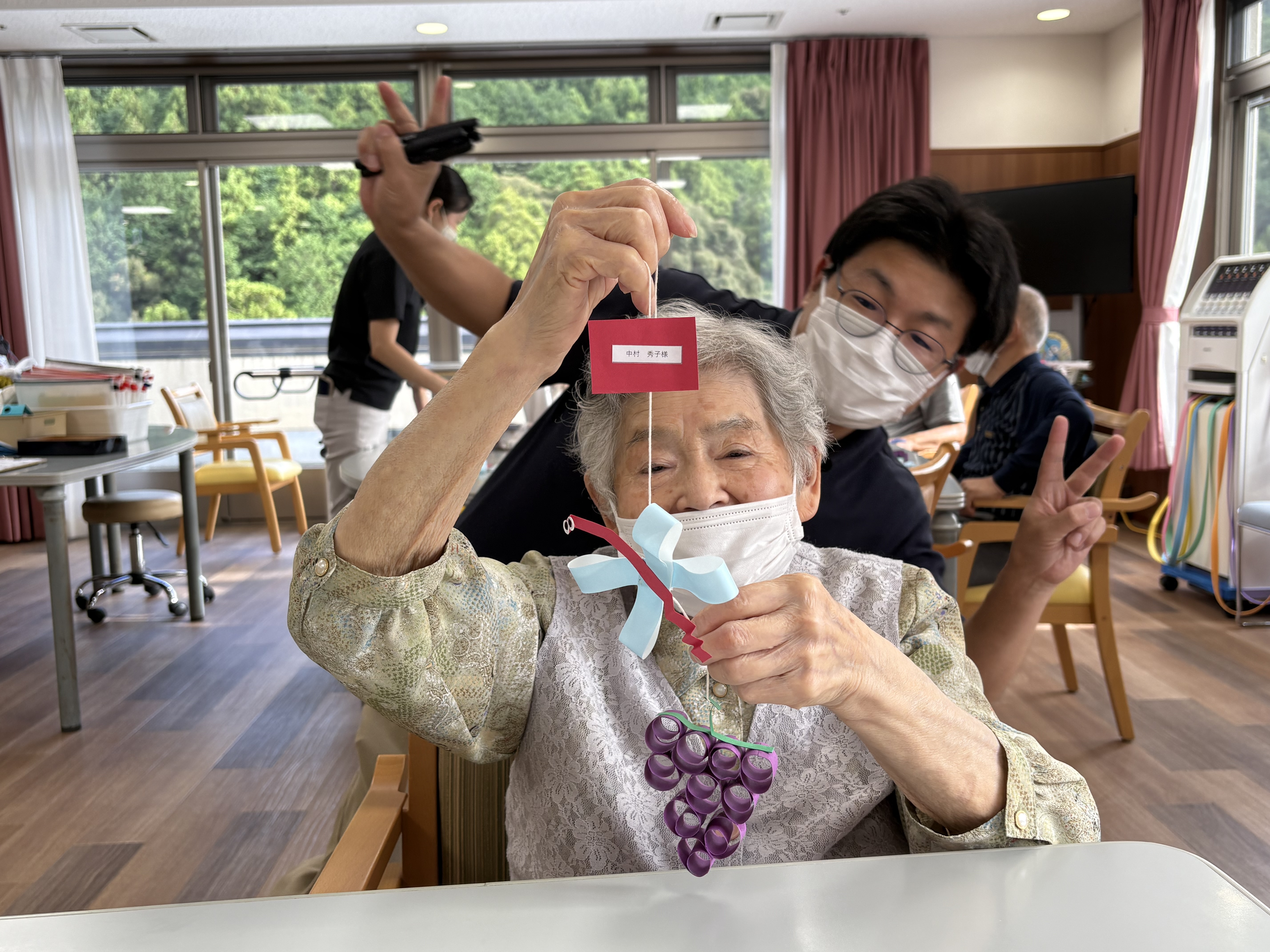 デイサービス ぶどうとトンボの飾り作り デイサービスでは、午後から9月の工作として、ぶどうとトンボの飾り作りをしました( ^)o(^ ) 1本の糸に、ぶどうと赤とんぼを付けていきます。 同じ向きに付けていくのが難しいんですっ💦