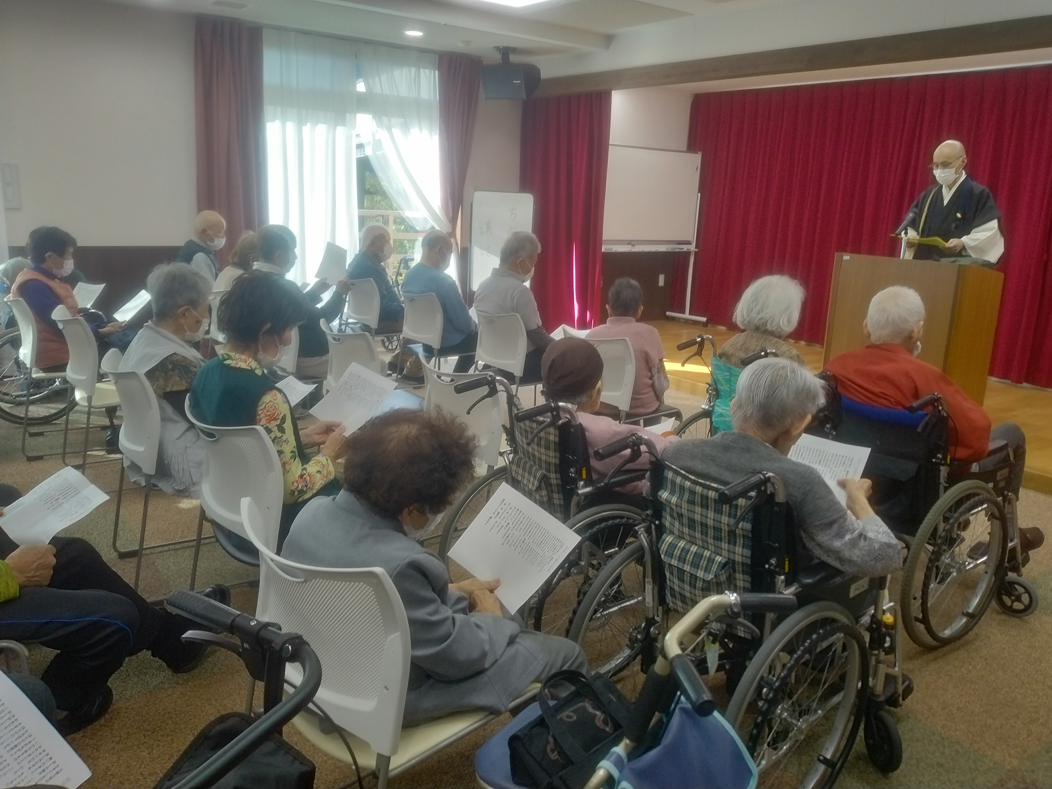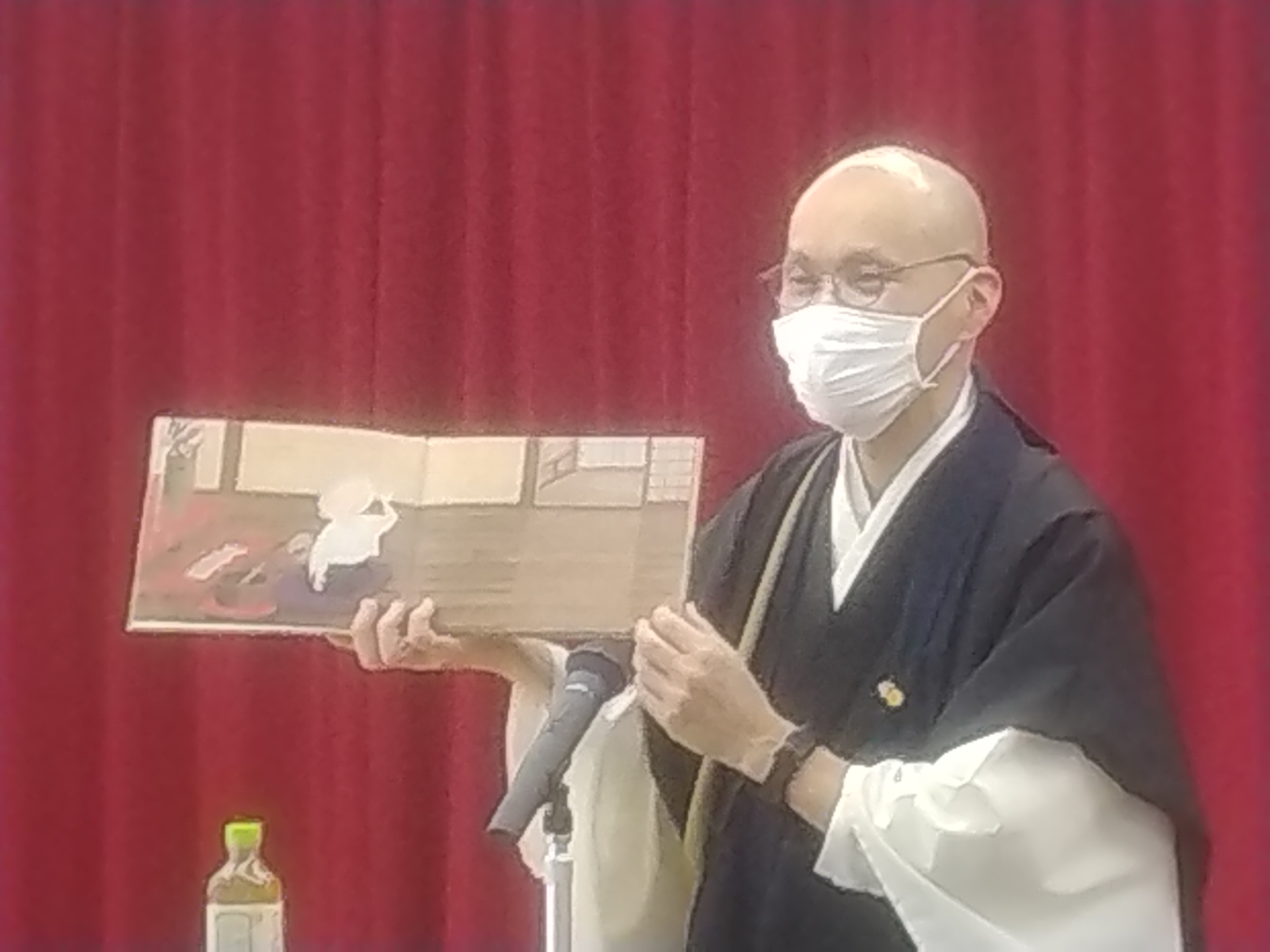 方廣寺講話 11月 11月の方廣寺の講話が行われました(*^^*) 本日は「ずいとんさん」の読み聞かせをしてくださいました 今月の講話は絵本の読み聞かせをしてくださいました(*^^*) 山寺の坊主ずいとんさんといたずら狐の掛け合いを抑揚ある声でお話ししてくださいました。 皆さん真剣に聴き入っておられました。